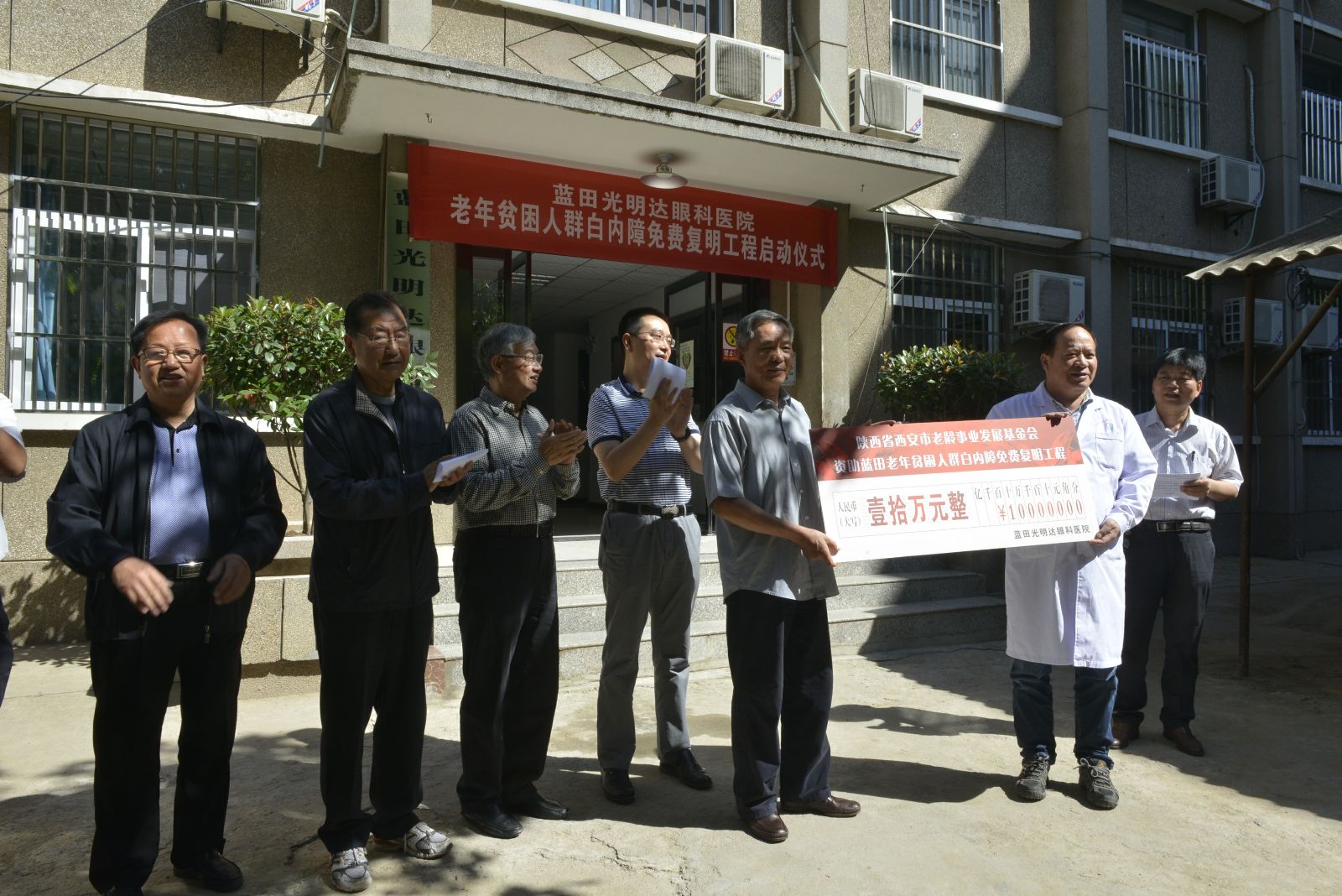 为了进一步推动老年希望工程,提高老年人的生活质量,使蓝田县患白内障的贫困老年人重见光明,我们西安市老龄事业发展基金会和蓝田县老龄工作委员会办公室、蓝田县光明达眼科医院携手共同开展“关注贫困老年眼健康、老龄基金送光明”活动。为此基金会决定资助10万元,全部用于资助蓝田县100名贫困老年白内障患者在光明达眼科医院做复明手术。